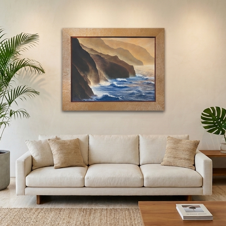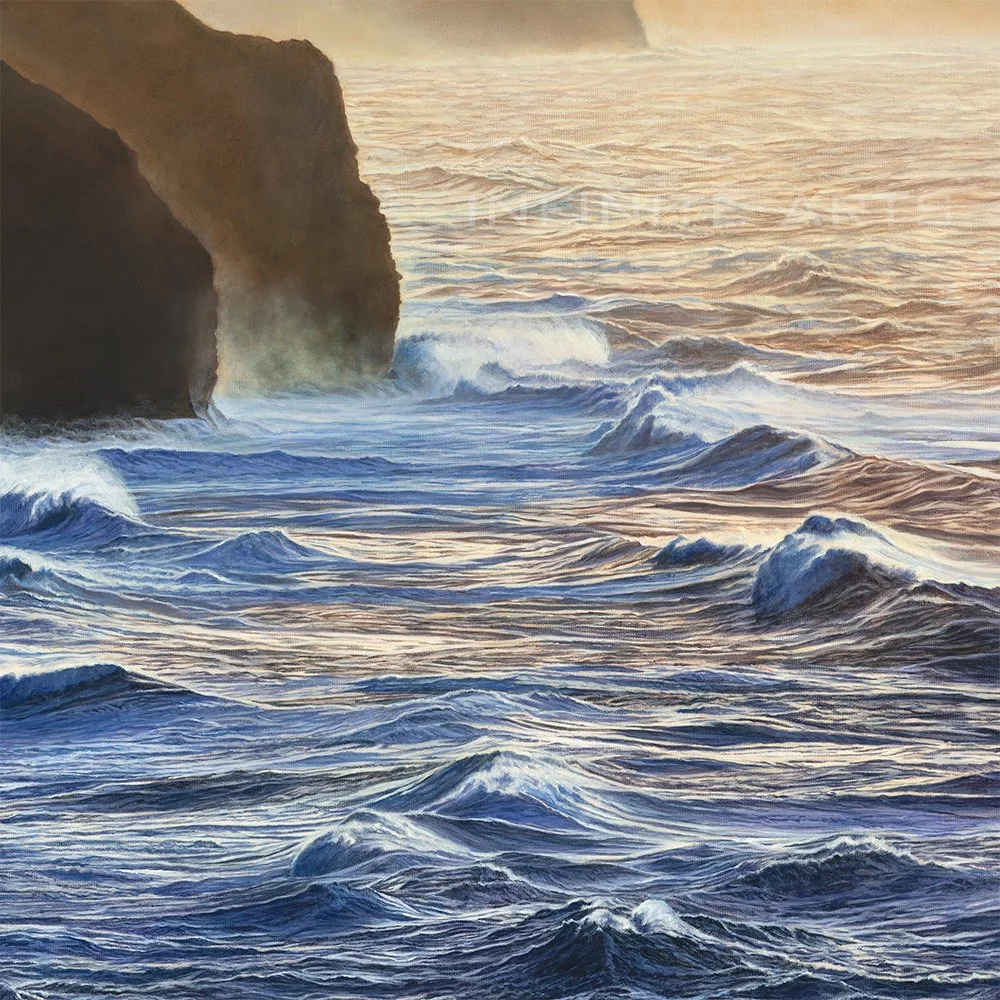 That quality is what the painting chases: the way immense force can produce something unexpectedly delicate. Ehukai has a compressed palette that gives it a particular mood — contained, intentional — and yet within that restraint lives an enormous amount of detail. The waves were painted with tiny brushes over the course of a year, four hundred hours of work to capture the intricacy of moving water, the subtle nuances of the cliffs, the dynamic mist that seems to shift as you look at it. Ehukai has serenity and power at once.