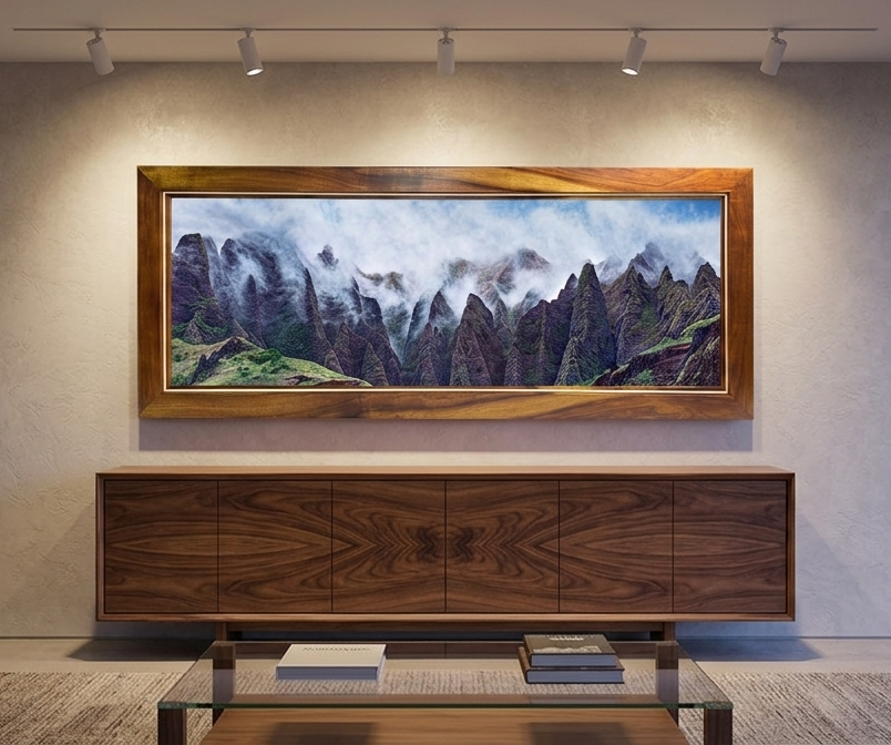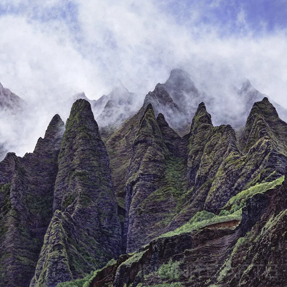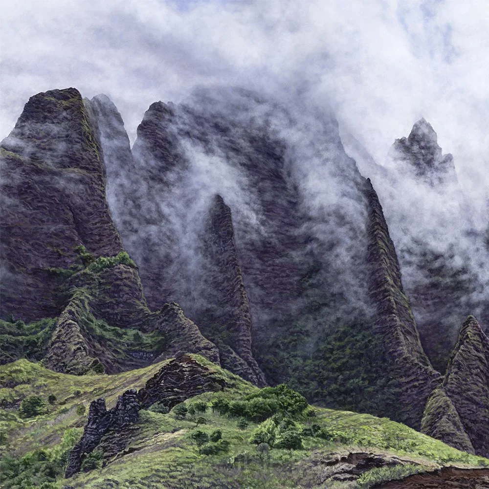 That feeling is what the painting chases — and what it took two years and more than four hundred hours to earn. The Guardians is many layers deep, built from countless layers and glazes: intricate detail in the rock faces, the particular way light moves through mist, the relationship between solid stone and shifting cloud. From across a room it feels alive and utterly real. Move closer and you find the language of brushstrokes that makes it happen — the interior journey of light, listening, intuition, and imagination that produced it.